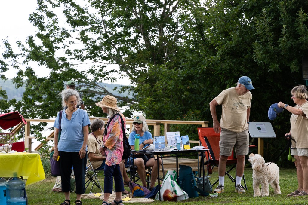 The sun was shining, people were swimming, children were playing on the beach, and others were walking their dogs – lots of people enjoying the island on a lovely summer afternoon. On the causeway, people set up tables, the band set up their equipment, and the food truck prepared to serve food. Chris Buchanan welcomed everyone then introduced Cloe Chunn who talked about all the birds, mammals, reptiles, marine life, trees and plants that would be lost if the wind port is built on the island. David Italiaander talked about the different roles of Friends of Sears Island, Alliance for Sears Island, and Protect Sears Island. The microphone was then opened to everyone and Jula Moll-Rocek talked about different species of fungi he has found on the island while conducting a survey for the Farlow Herbarium at Harvard. He and his partner had put on display about 10 different fungi that will be donated to the Farlow Herbarium. During the afternoon, T-shirts and lawn signs were purchased, many people asked questions about the wind port and fact sheets handed out. Late afternoon there was a short deluge of rain that drove some people back to their cars, but the band played on.